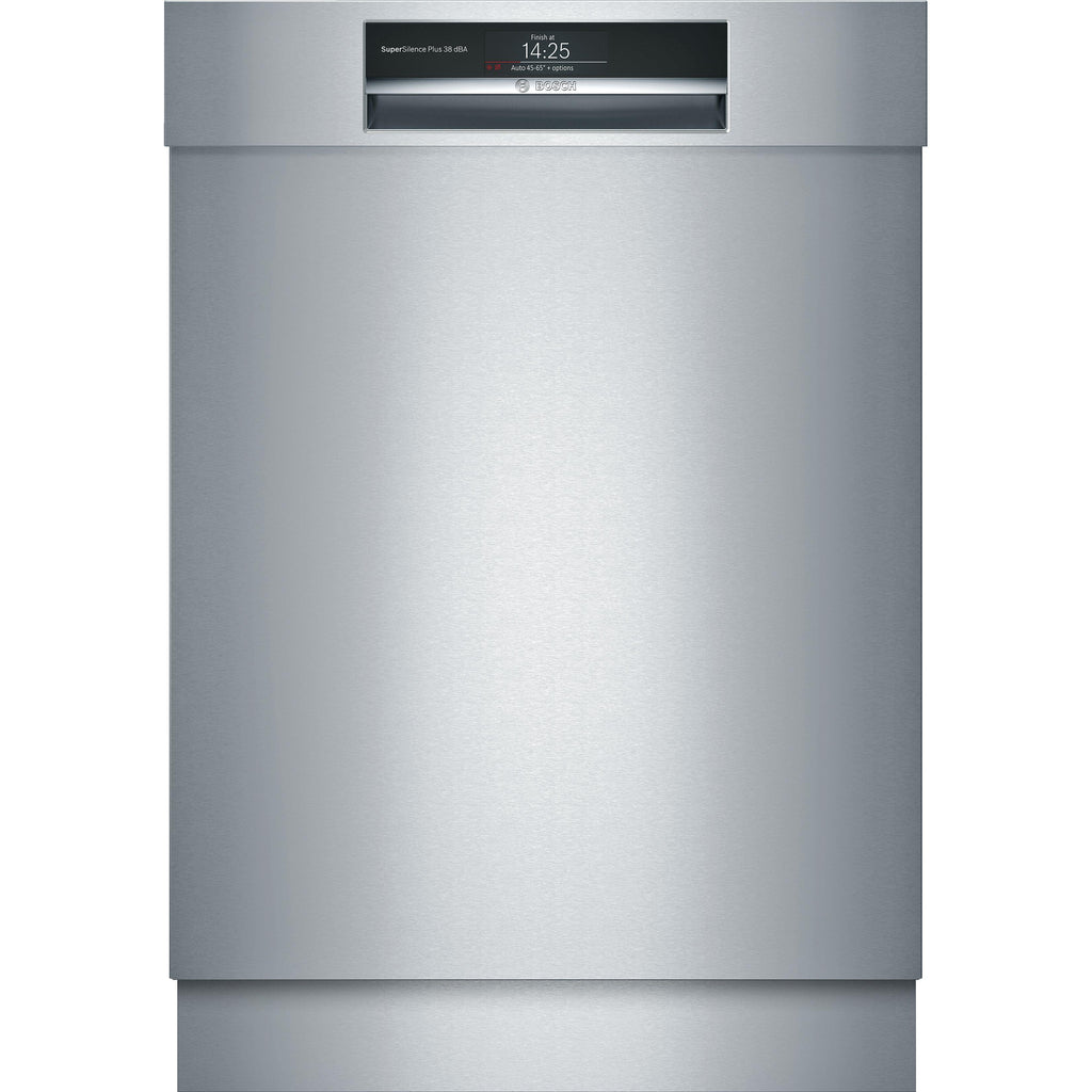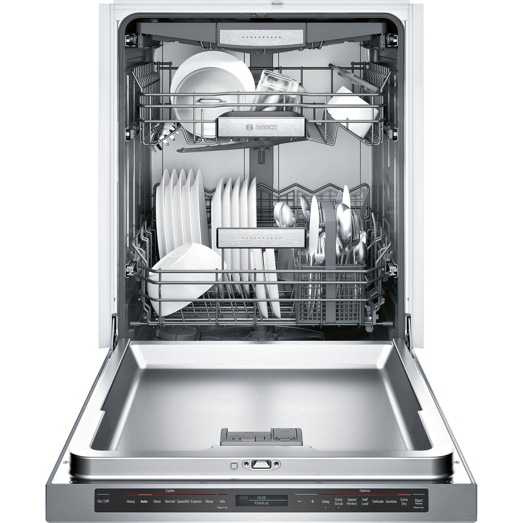 ×This Bosch Benchmark Series 24" dishwasher features RackMatic® on upper rack, 3 level EasyGlide™ rack system and can fit up to 15 place settings. The full color TFT display is easy to read and easy to navigate.