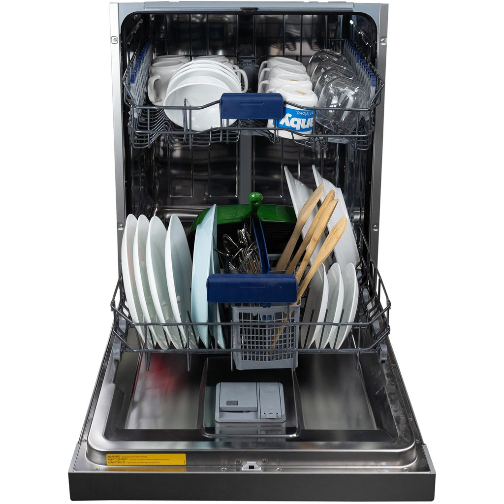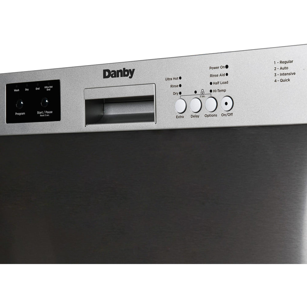 ×The Danby 24" Built-In Dishwasher in Stainless Steel combines durability, efficiency, and style. Its stainless steel tall tub design resists stains, odors, and rust, ensuring a pristine look for years. Operating quietly at 51 dB, it maintains a peaceful kitchen ambiance. Energy Star® compliant, this dishwasher is both eco-friendly and cost-effective. With a 14-place settings capacity and 4 versatile wash cycles, it easily handles large family meals or dinner parties. The convenient delay start feature allows you to schedule washes up to 24 hours in advance. The fixed upper dish rack and upper basket mug shelf provide secure and organized spaces for all your dishes.