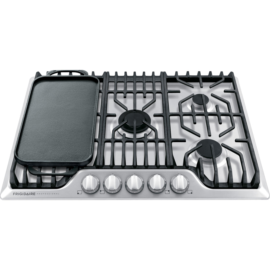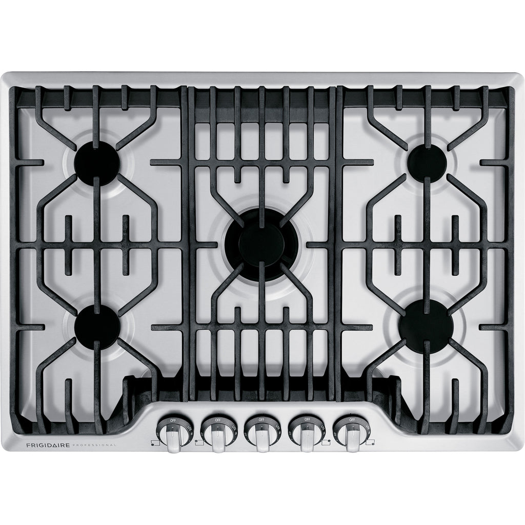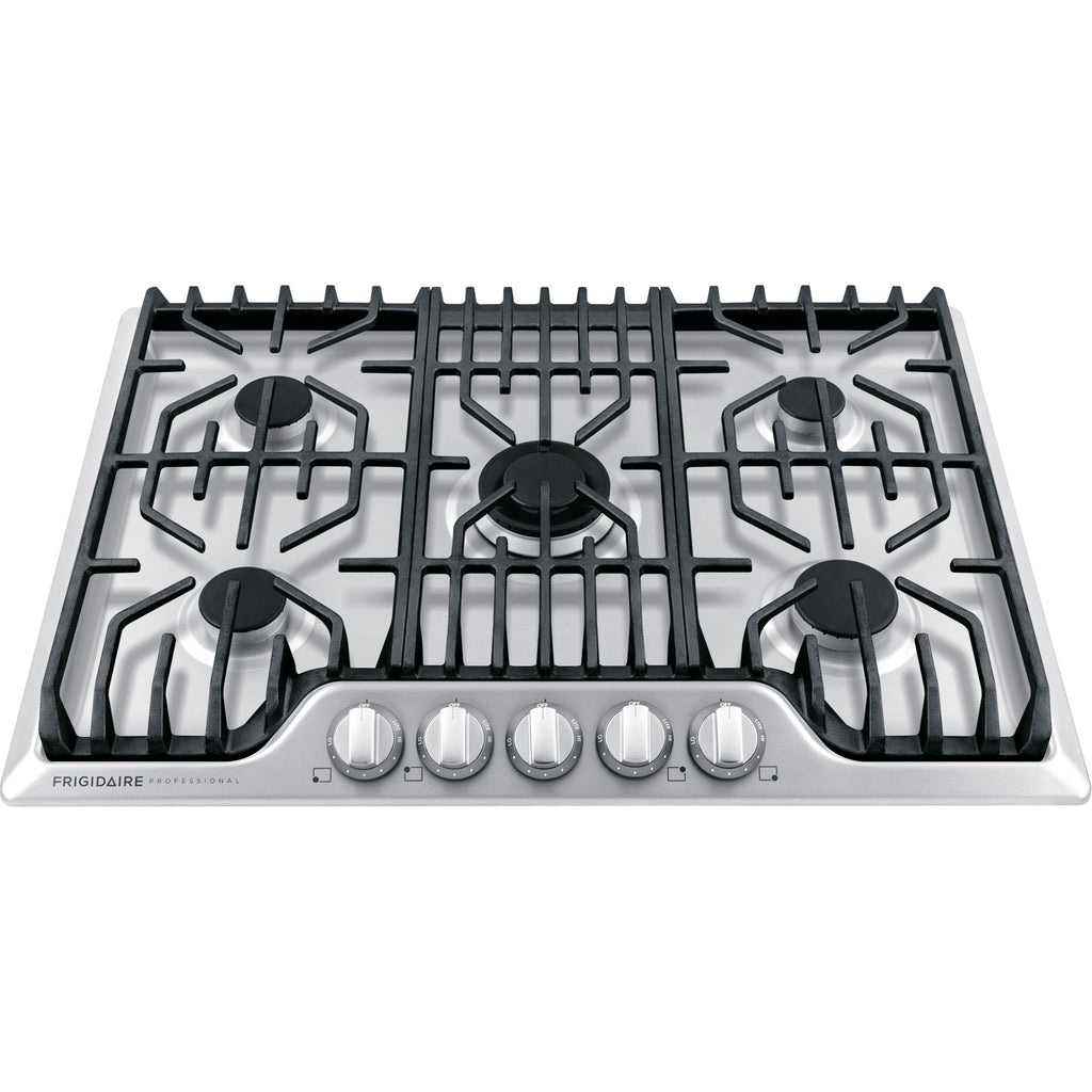 ×This Frigidaire Professional 30" gas cooktop is equipped with 5 sealed burners. It also features PrecisionPro™ controls, continuous cast iron grates with black matte finish and metal knobs. The entire cooktop surface is stainless steel to blend with the other appliances in your kitchen.