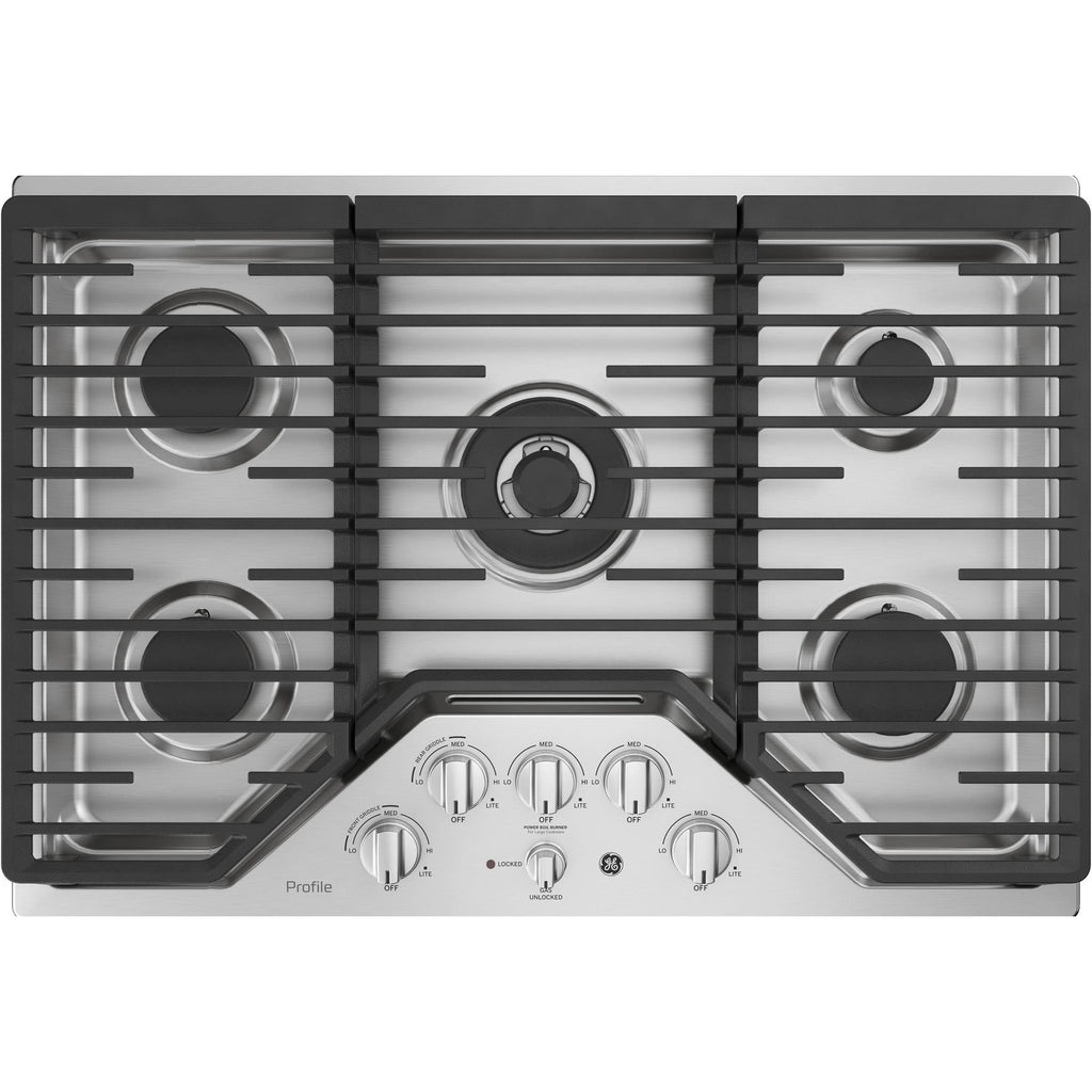 ×This GE Profile™ series 30" built-in gas cooktop features heavy-cast, edge-to-edge dishwasher safe grates and a precise simmer burner.
