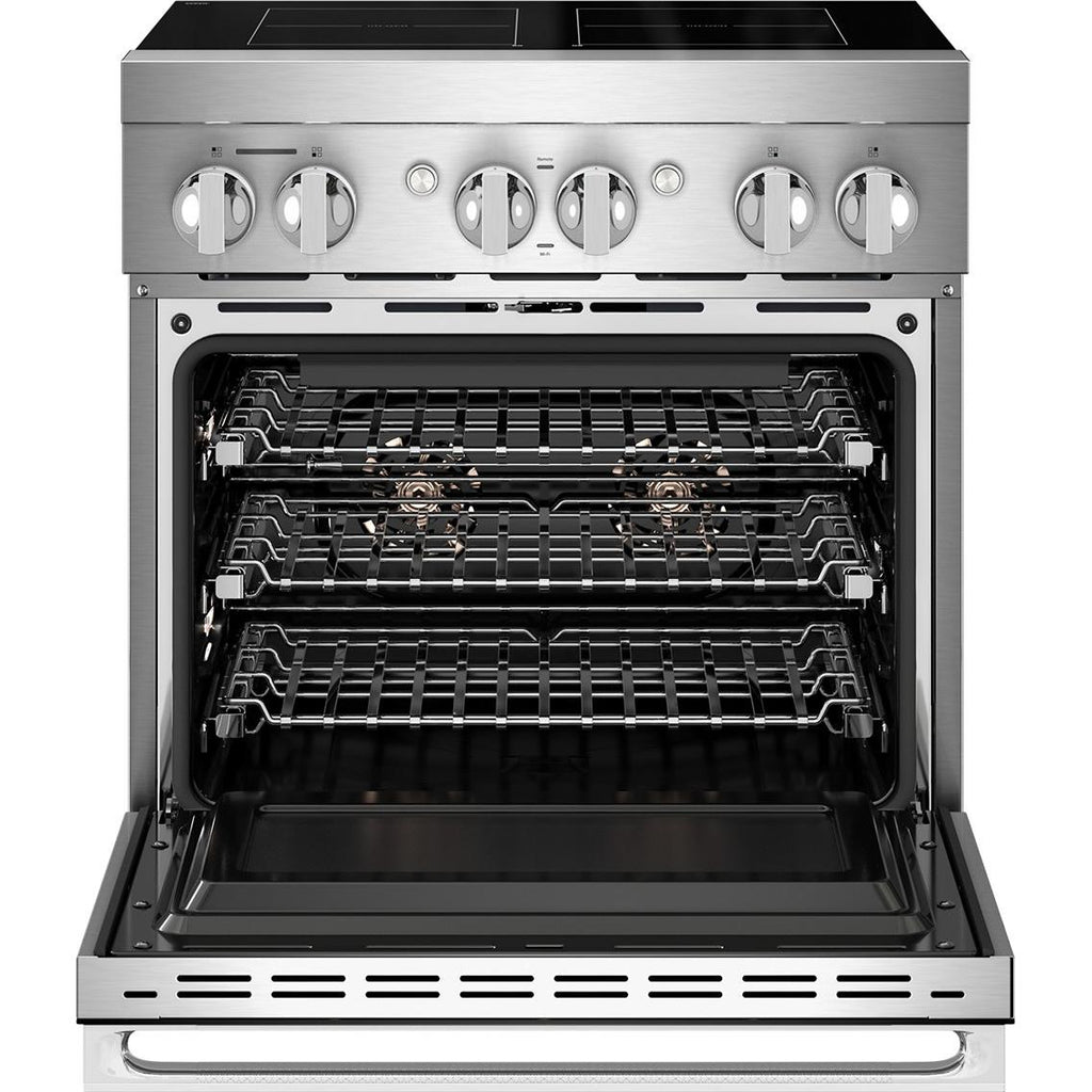 ×JennAir RISE™ 36-Inch Induction Professional-Style Range. Experience precision and power with knob-controlled induction cooking, Flex-Choice™ Zone. Featuring Assisted Cooking, remote access via the Culinary Center, and Dual-Fan True Convection, this range delivers professional results with modern convenience.