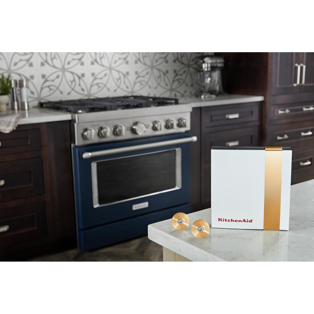 ×This KitchenAid® Commercial-Style Range Handle Medallion Kit, New Gold, lets you change the color of your handle medallions to add a custom accent. The kit includes 2 new gold medallions and a 1/8 hex allen wrench for easy replacement. Order one medallion kit per range handle. Installation of these handle medallions requires basic hand tools and novice repair experience.