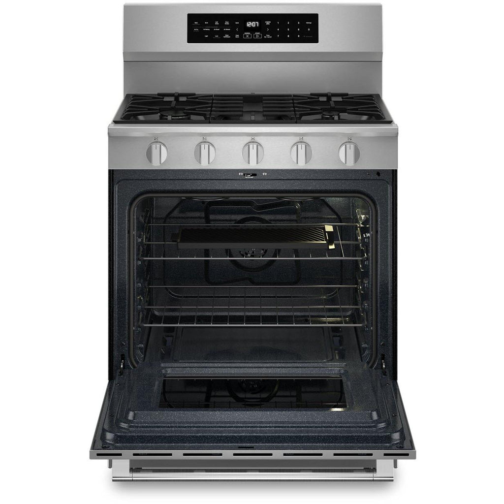 ×Maytag 30-inch gas range features 5 cooktop burners, digital display and Convection technology.