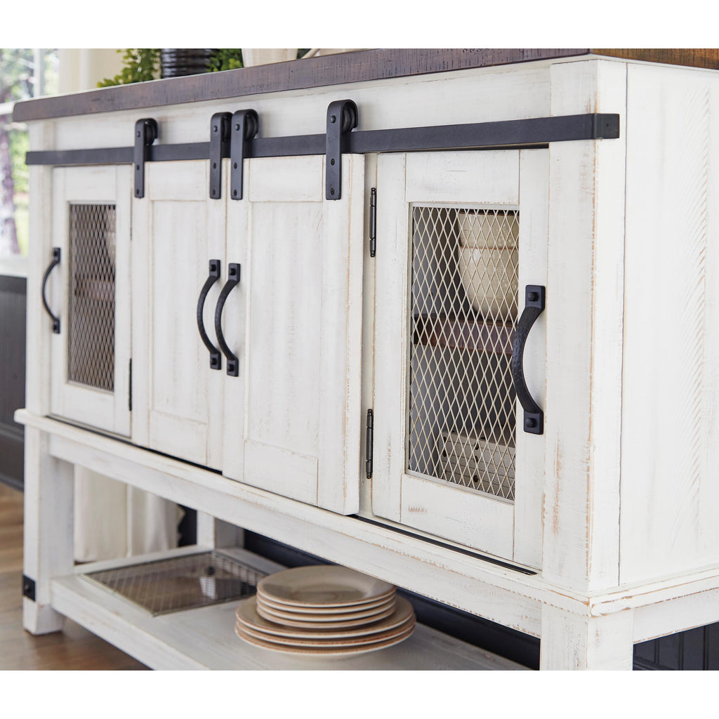 ×To those with an appetite for rustic farmhouse living, this server dishes out irresistible form and function. A pair of cabinet doors with mesh wire inlays add a countrified cool element. Sliding “barn doors” revealing even more shelved storage are right on trend. This server’s two-tone aesthetic pairs a distressed vintage white with an aged natural pine color top for twice the charm.