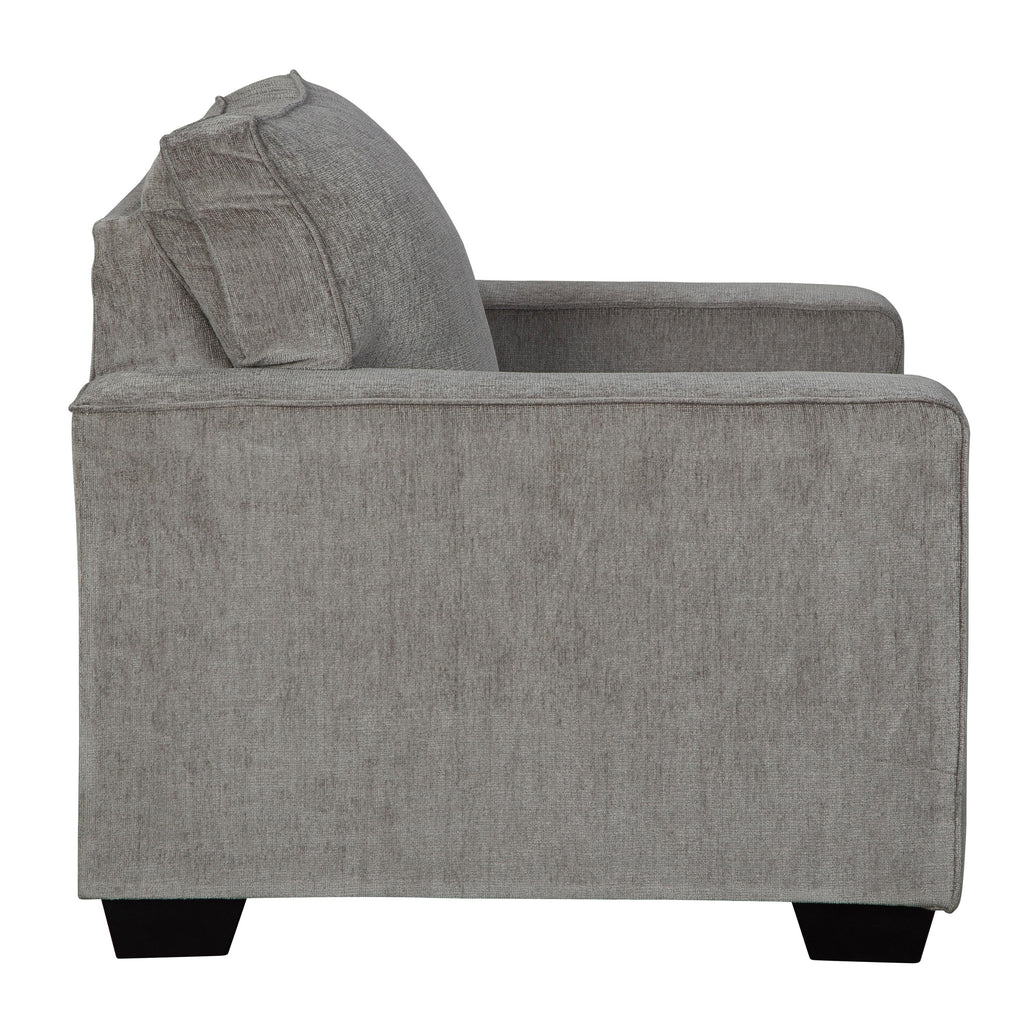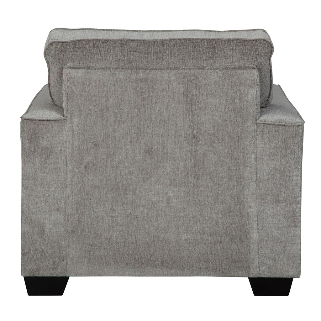 ×If style is the question, then this striking chair is the answer. Sporting clean lines and sleek track arms, the decidedly contemporary profile is enhanced with plump cushioning and a chenille-feel upholstery that's so pleasing to the touch. Rest assured, this chair in richly neutral alloy is sure to play well with so many color schemes.