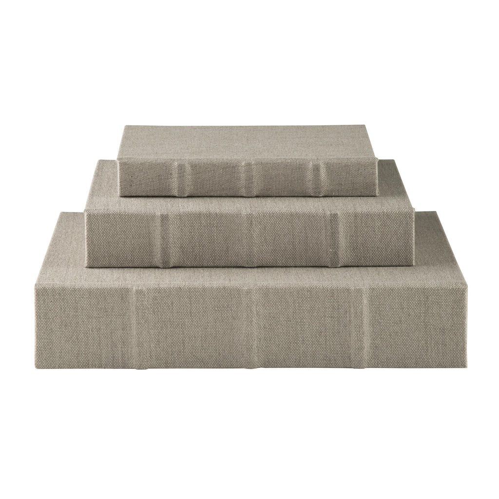 ×This set of three keepsake boxes makes storage so quietly understated. The beige linen cover is complemented inside with a black velvet lining. The perfect place for your dearest keepsakes, this set adds a touch of casual elegance to your decor.