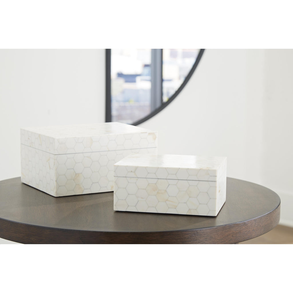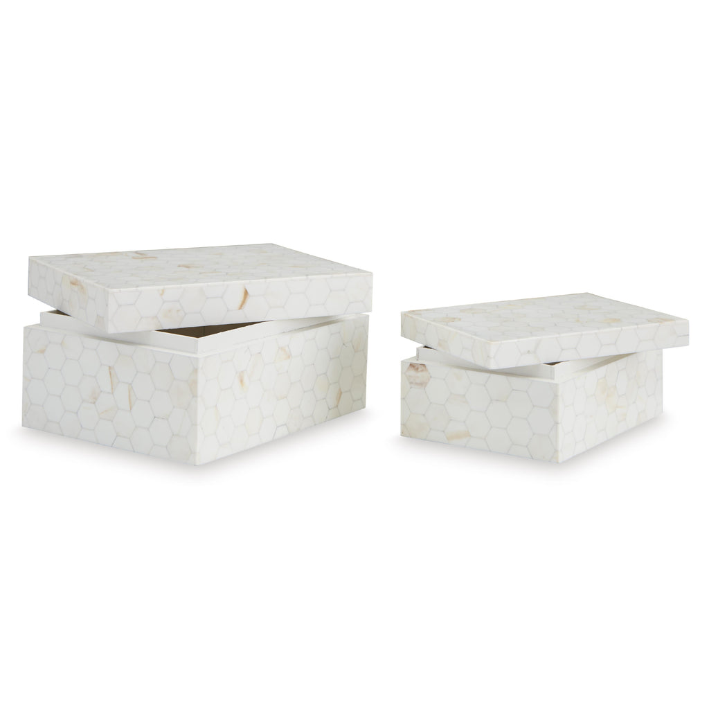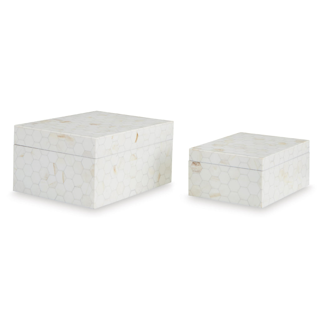×Looking for a casually cool home accent? This set of boxes stacks up beautifully. A hexagonal mosaic design and cream finish bring a laid-back element to your decor. What a stylishly effortless way to refresh your shelves and tabletops.
