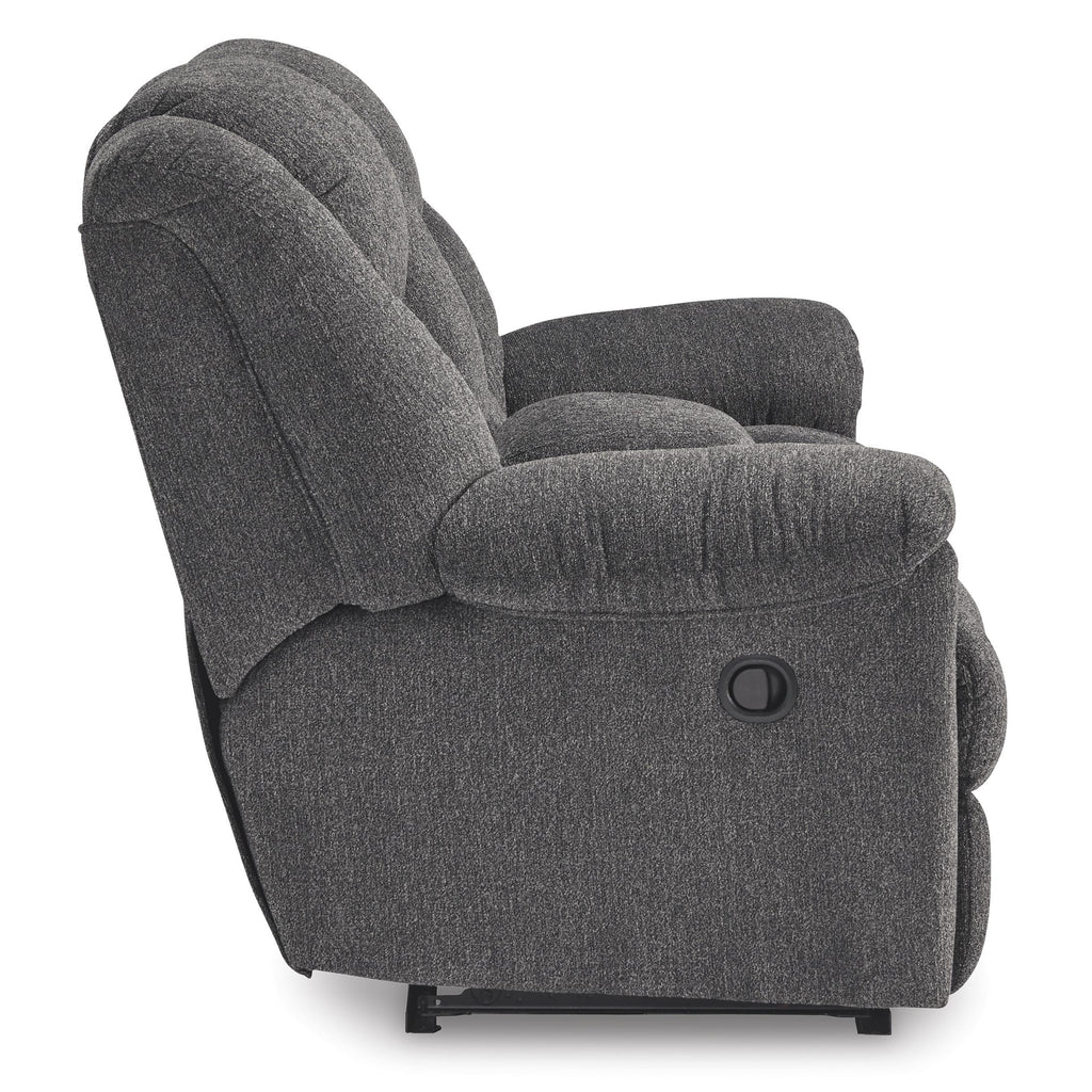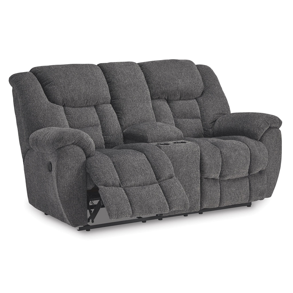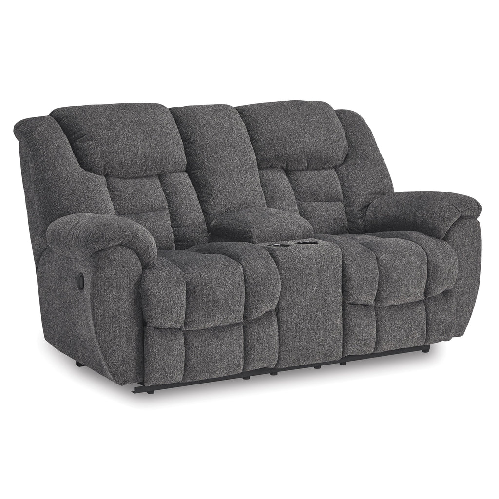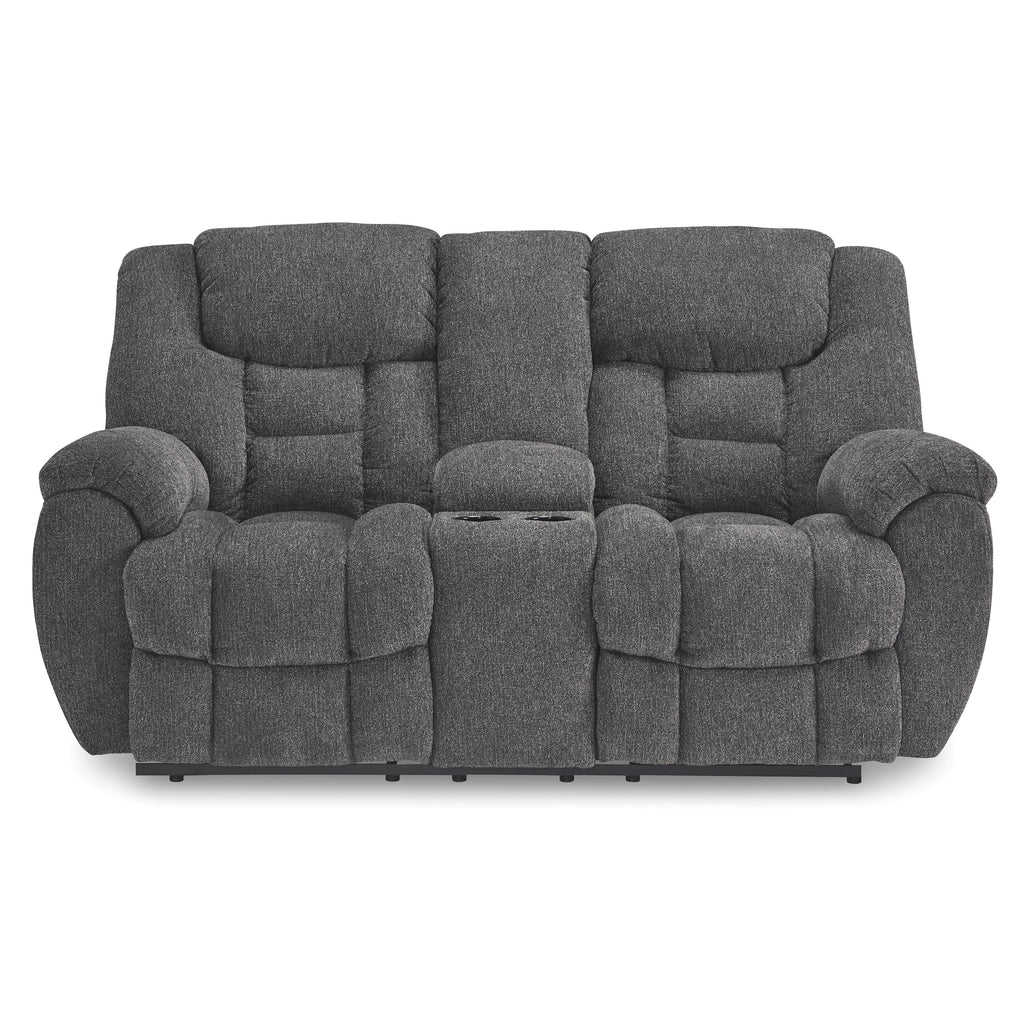 ×Sometimes seeing is believing. And you can rest assured that this reclining loveseat with console is every bit as indulgent as it looks. Designed to put you in the lap of luxury, the generously scaled seating—wrapped in a wonderfully plush and practical charcoal gray Next-Gen Nuvella™ upholstery—sports pillow-wrapped armrests and curvaceously cushioned head-neck support for feel-good flair.
