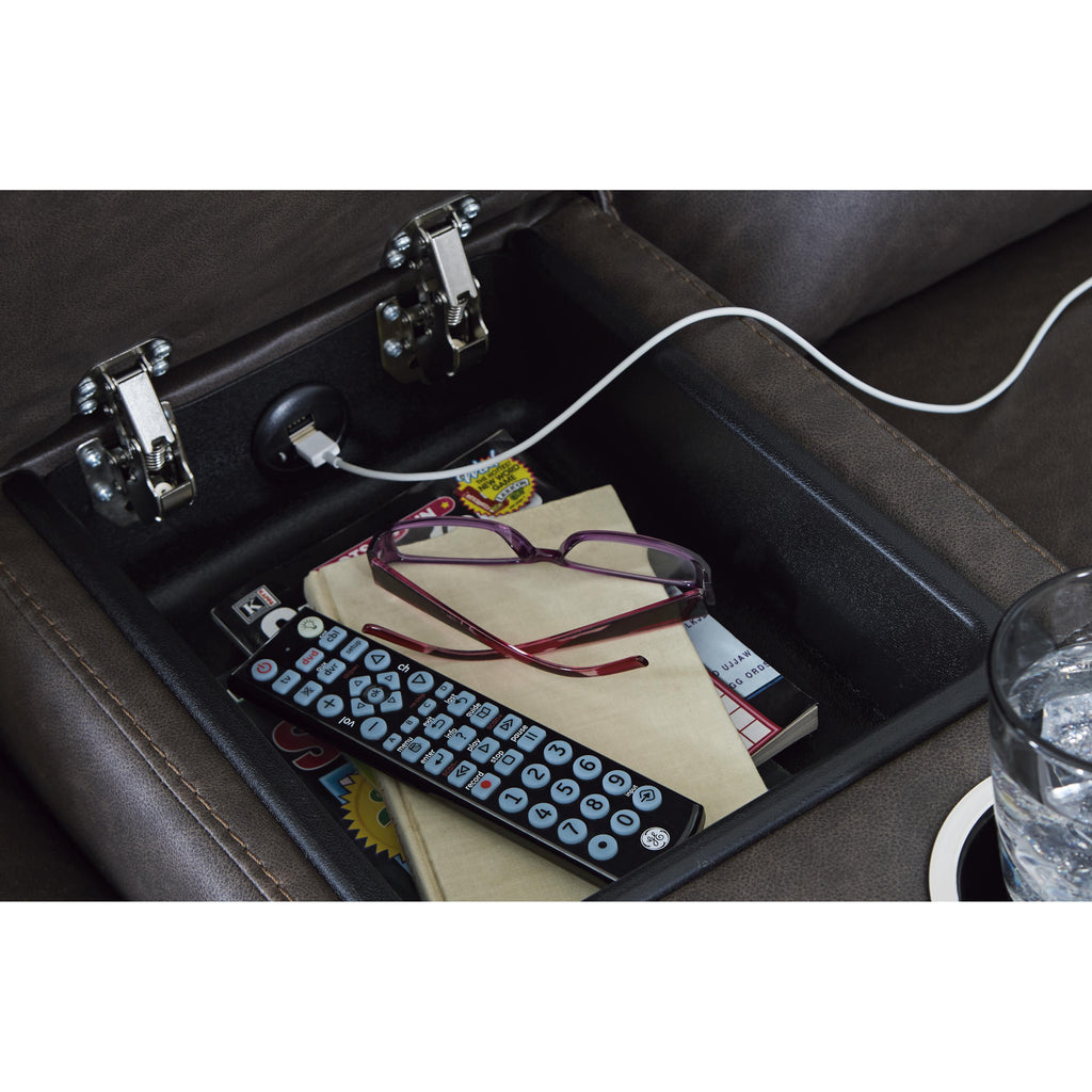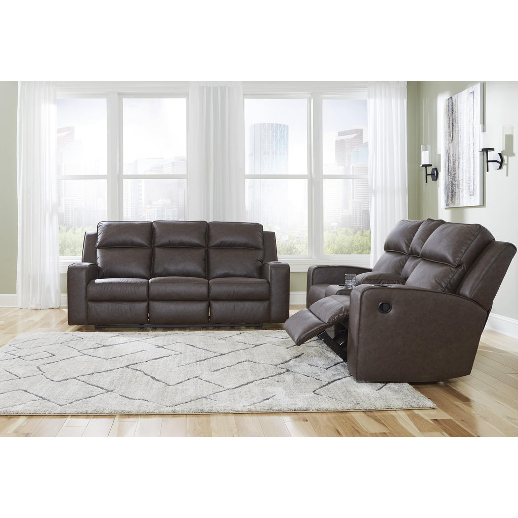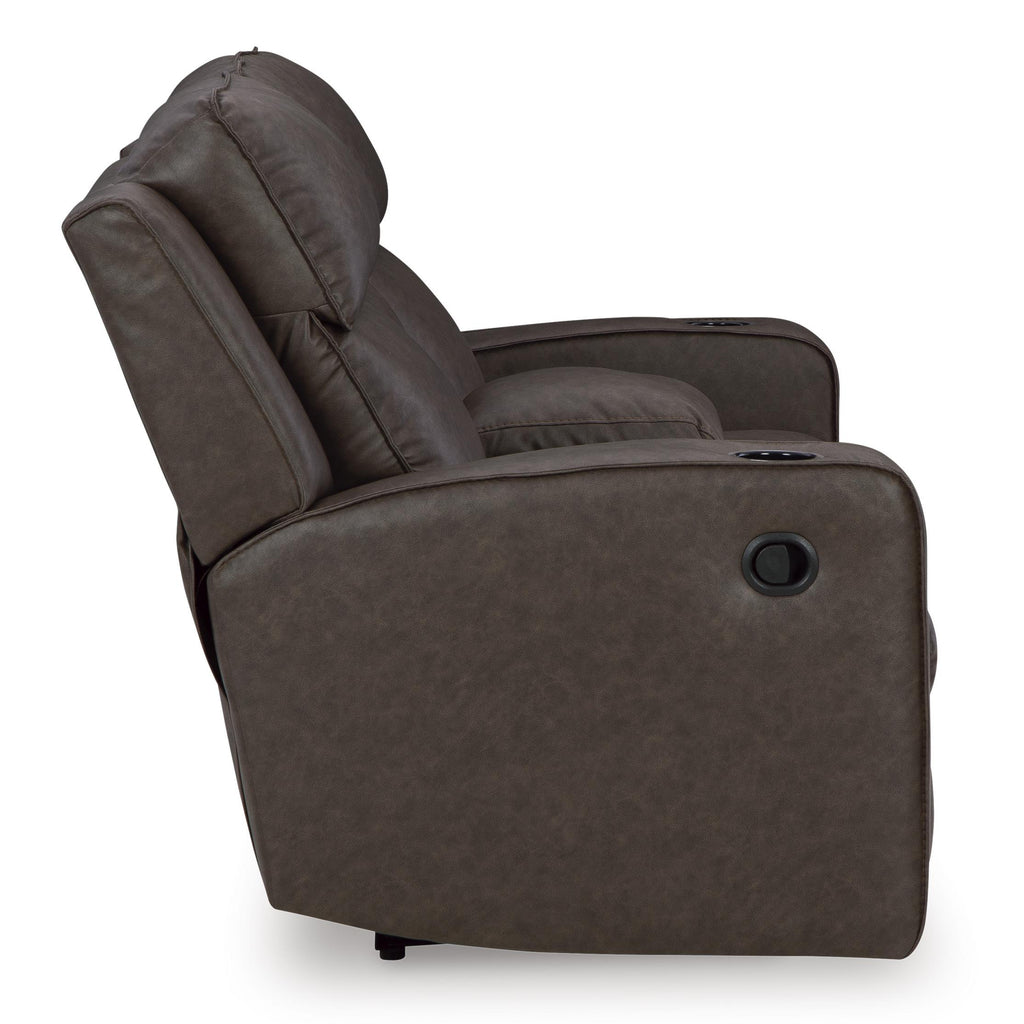 ×Indulge your lust for comfort and love for contemporary design with this reclining loveseat. Made for easy everyday living, it’s upholstered in a heavyweight padded faux leather and accented with contrast jumbo stitching for fashion-forward flair. Sleek track arms elevate the look with a touch of modern sensibility. A padded center console with dual cup holders completes the experience.