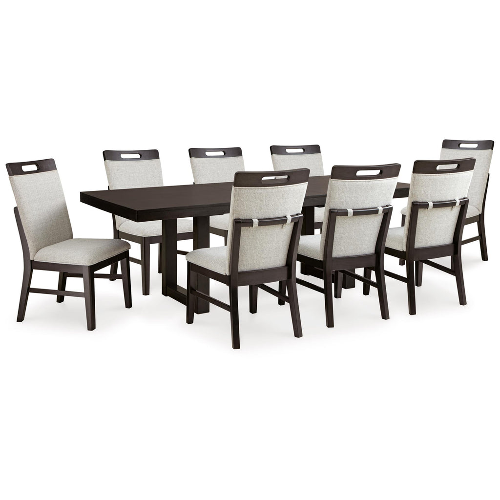 ×This dining package is the perfect blend of modern and contemporary styles. Its solid construction and easy-clean Nuvella® upholstery make it both durable and easy to care for. Incorporating high style and low maintenance, this is a set you’ll enjoy for years. This set includes eight chairs and a dining table.