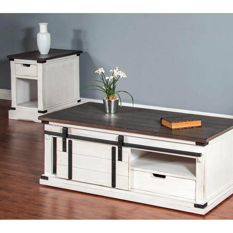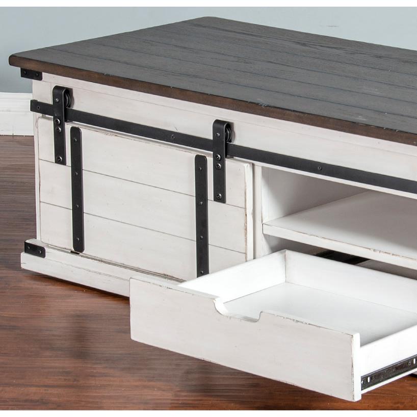 ×This French Country coffee table was designed with barn door hardware, which makes it the perfect companion for barn door media consoles with similar features. It features a drawer and casters. It was crafted using mahogany and Mindi solids and veneers from Indonesian kilns.