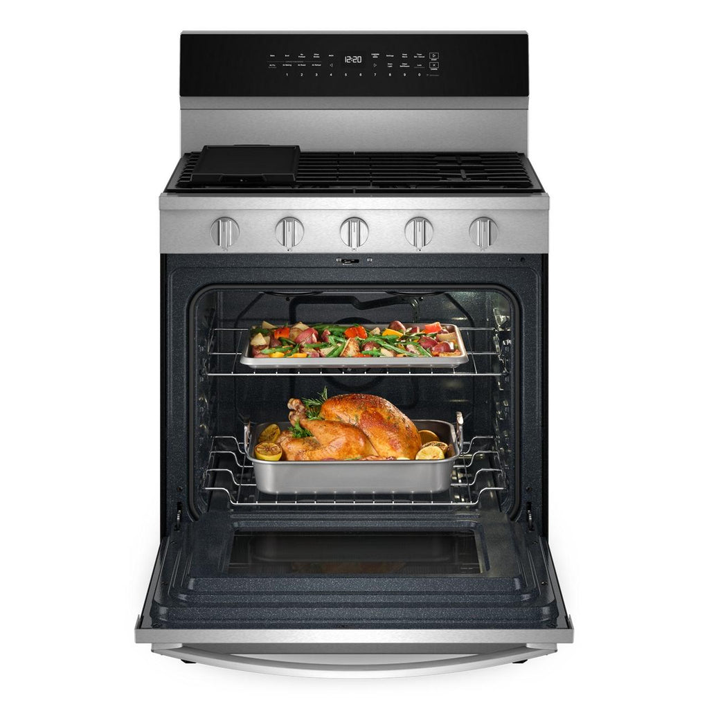 ×The Whirlpool 30-inch Freestanding Gas Range features Air Fry Technology and a spacious 5.3 cu. ft. oven capacity. This range offers versatile cooking options and ample space, allowing you to prepare healthier, crispy dishes right in your oven.